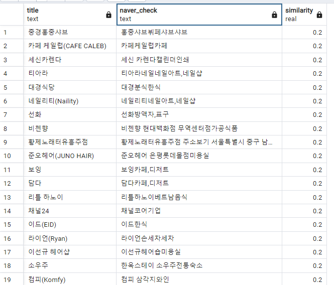 (SELECT title, addr, naver_check, similarity(title, naver_check)
