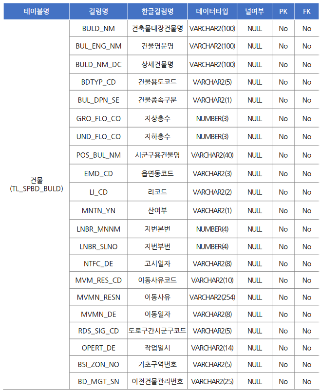 주소정보누리집에서 제공하는 건축물 데이터는 아래와 같은 정보를 가진다.