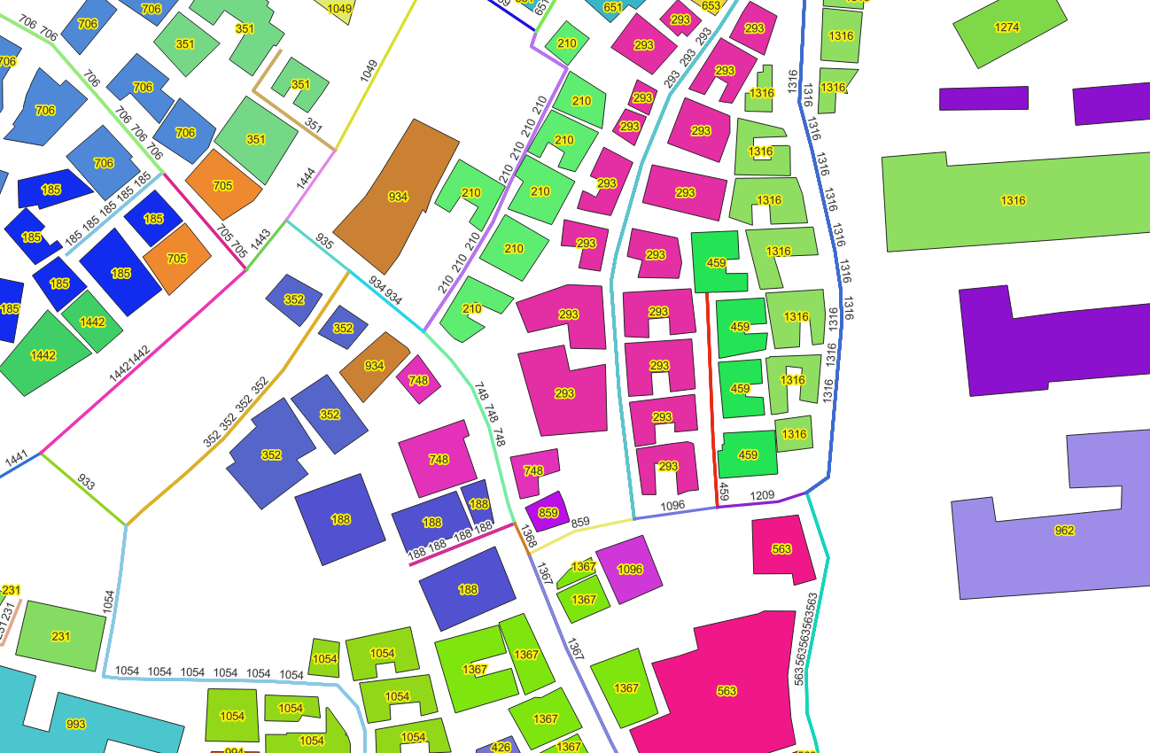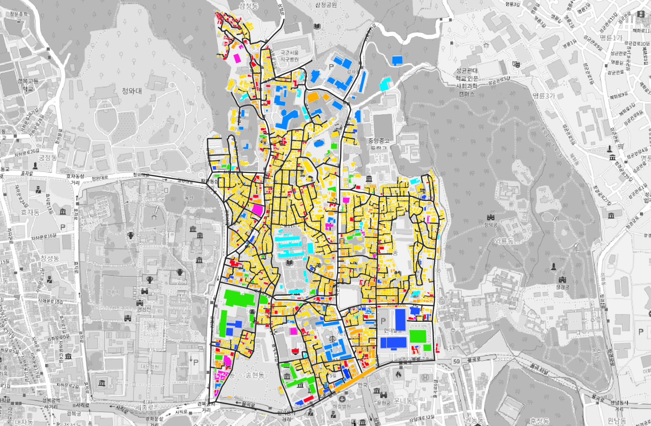 같은 색상을 가진 건축물끼리는 같은 도로에 할당되었다.