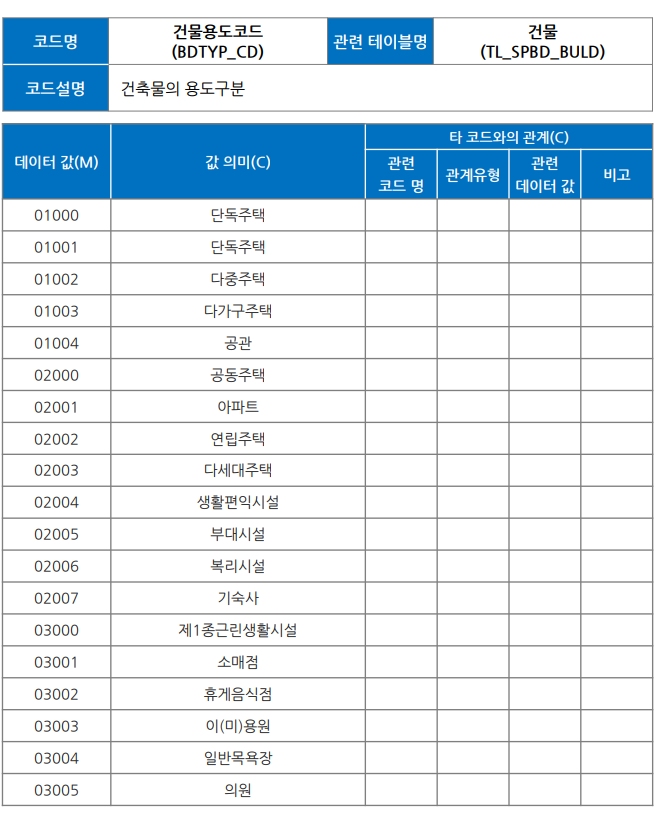 우리는 저 많은 항목들 중 건물용도코드, BDTYP_CD 를 중점적으로 다룰 거다.