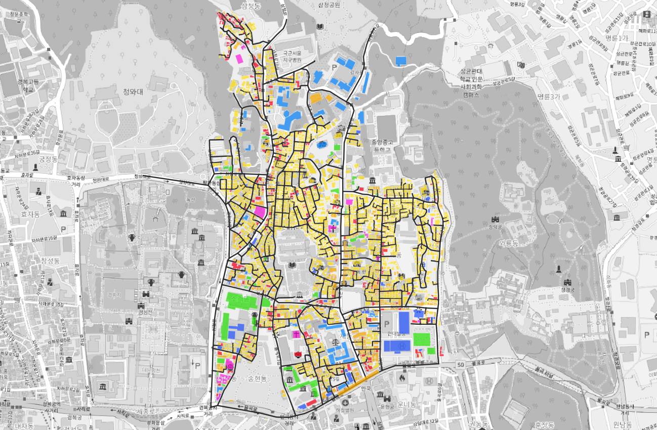 특정 도로가 어떠한 공간적 속성을 가지고 있는지 구분할 때, 인접한 건축물의 용도가 중요하다.