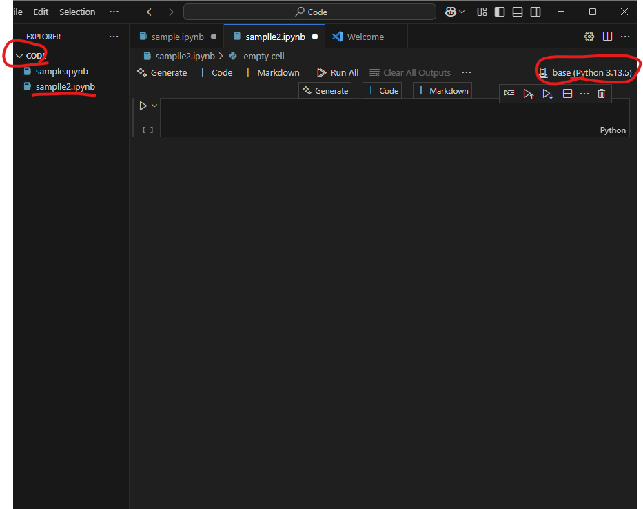 오른쪽 위에서 "Select Kernel" --> "Python Environment" --> "base (Python 3.13.5)" 를 선택해준다.